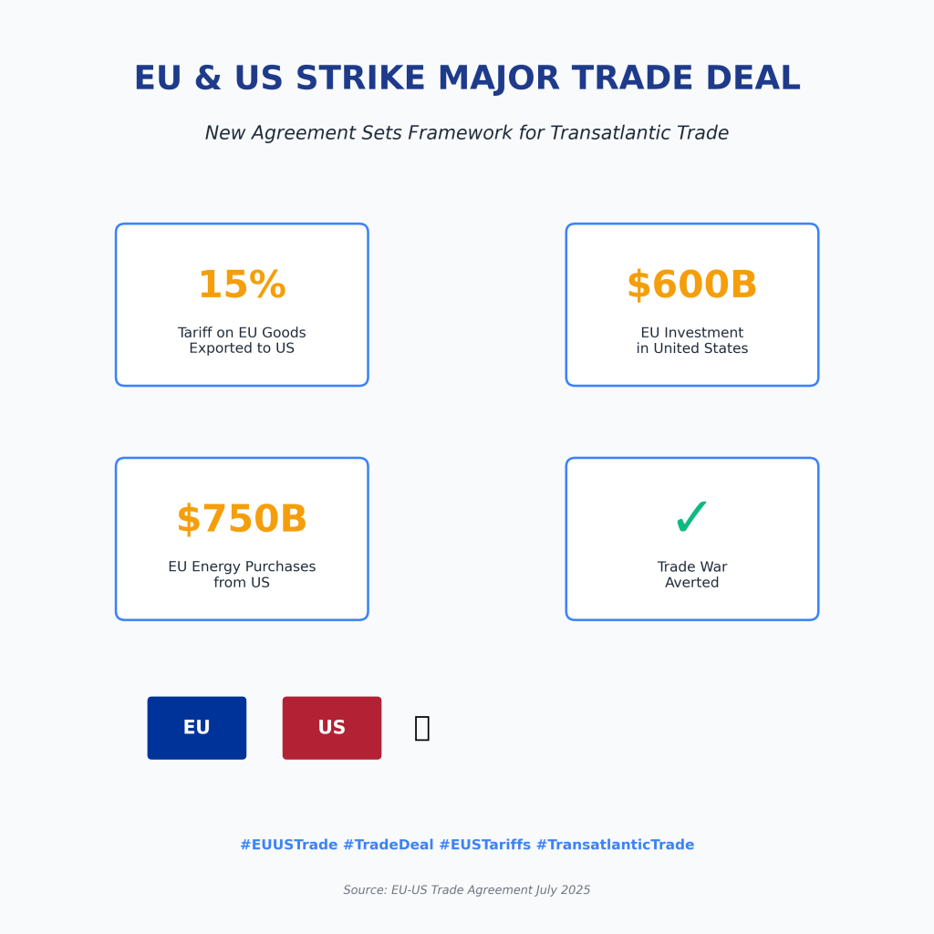 • 15% tariff on most EU exports to the US (down from a threatened 30%)