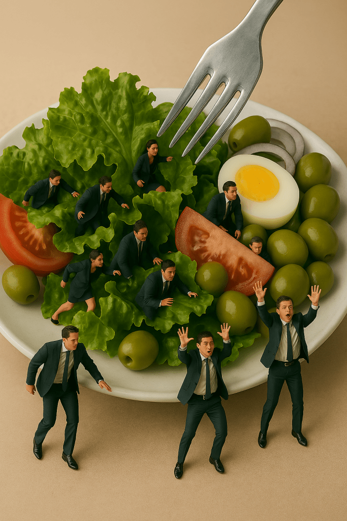 En invierno cogía la cuchara, para comer o para cenar y ¡zasca! un político saltaba de ella. En julio sólo veía políticos colgando del borde de la jarra del gazpacho, o escondiéndose entre las hojas de lechuga de la ensalada para que no los pinchara el tenedor.