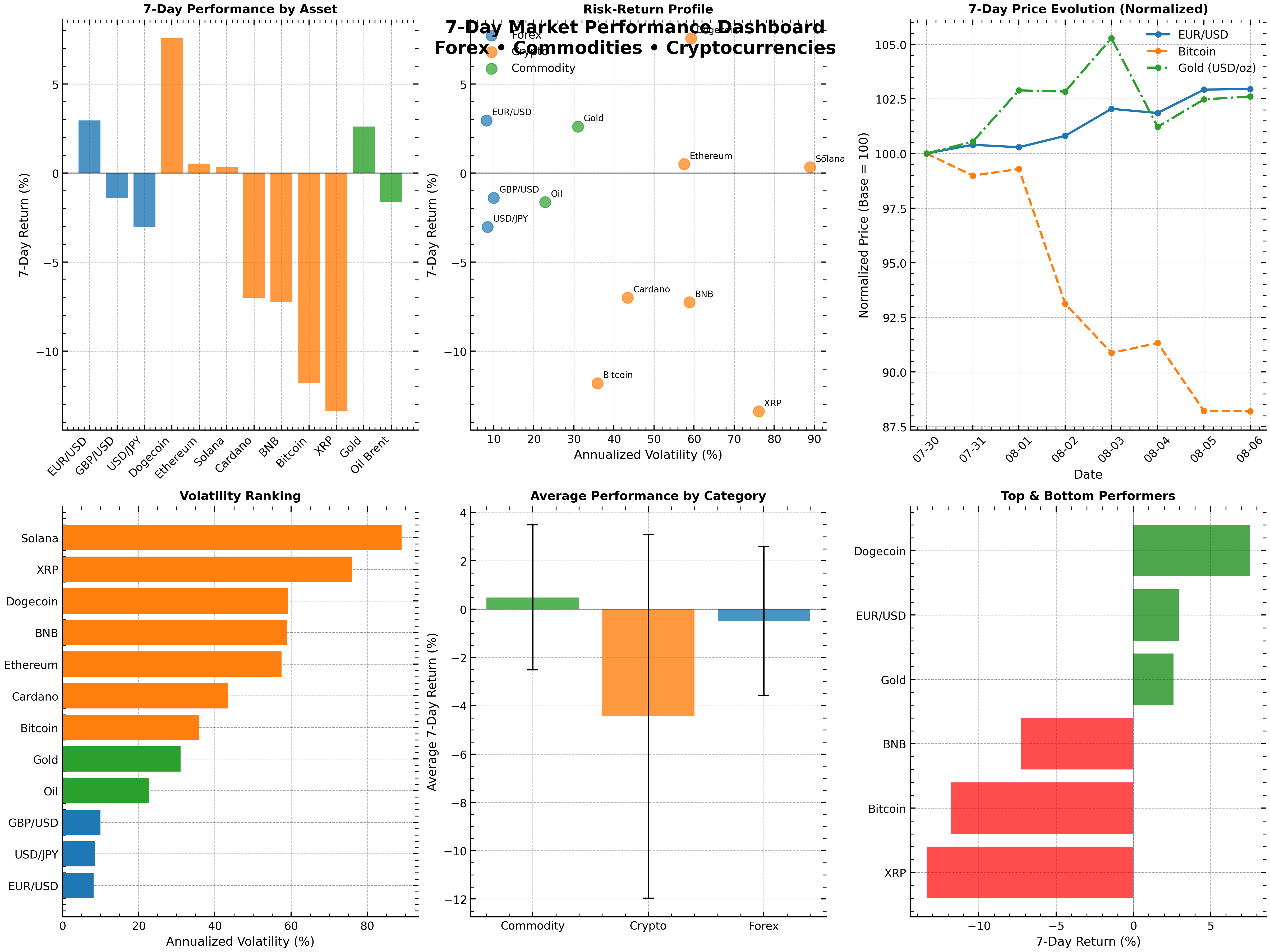 | Cripto | Dogecoin (+7,57%) | XRP (–13,38%) | Volatilidad, retornos mixtos |