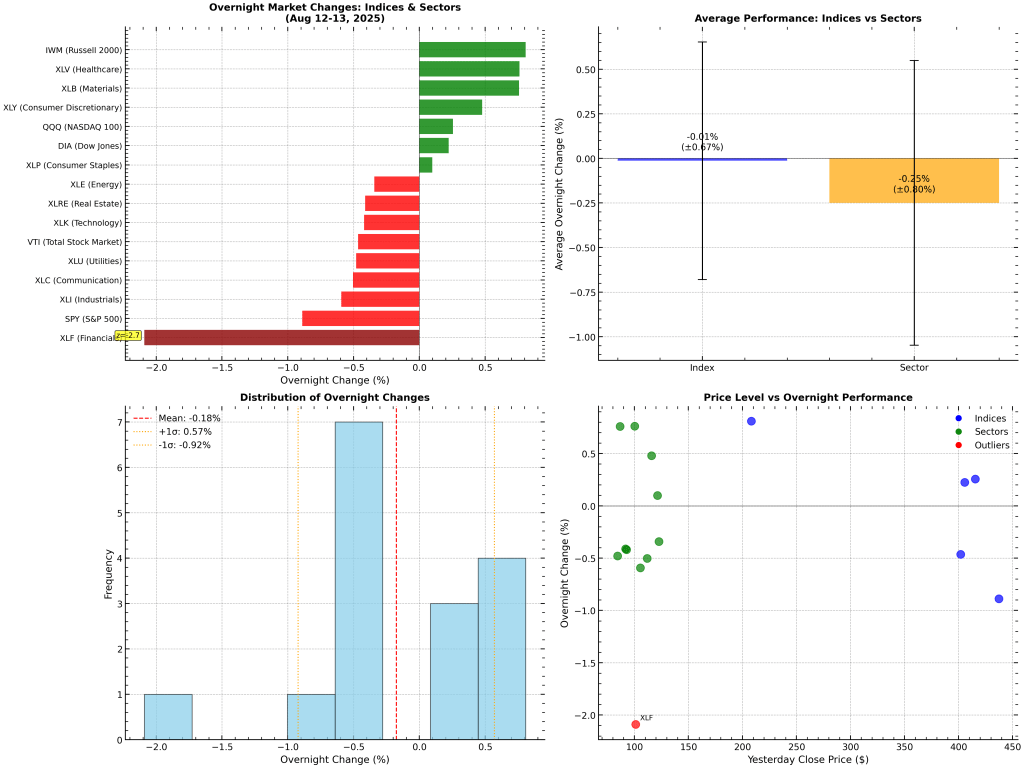 Figura: Variaciones porcentuales nocturnas de los principales índices y sectores. El financiero destaca como el mayor declinante.