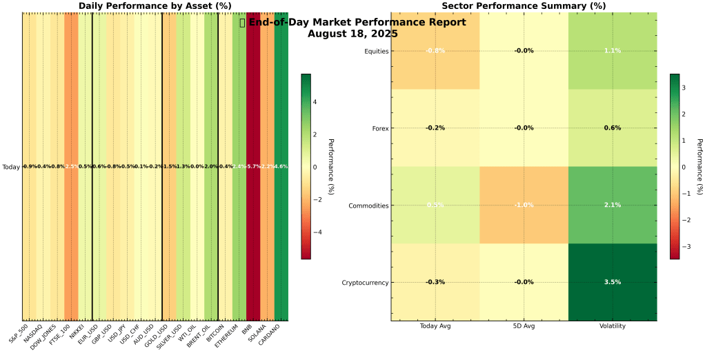 Key Takeaway: The trading day ended with a defensive tilt: equities and forex slipped, commodities rebounded, and cryptos saw selective gains. Cardano and Brent oil led their groups, while FTSE 100 and BNB lagged. Dive in for a concise, actionable wrap-up of today’s global markets.