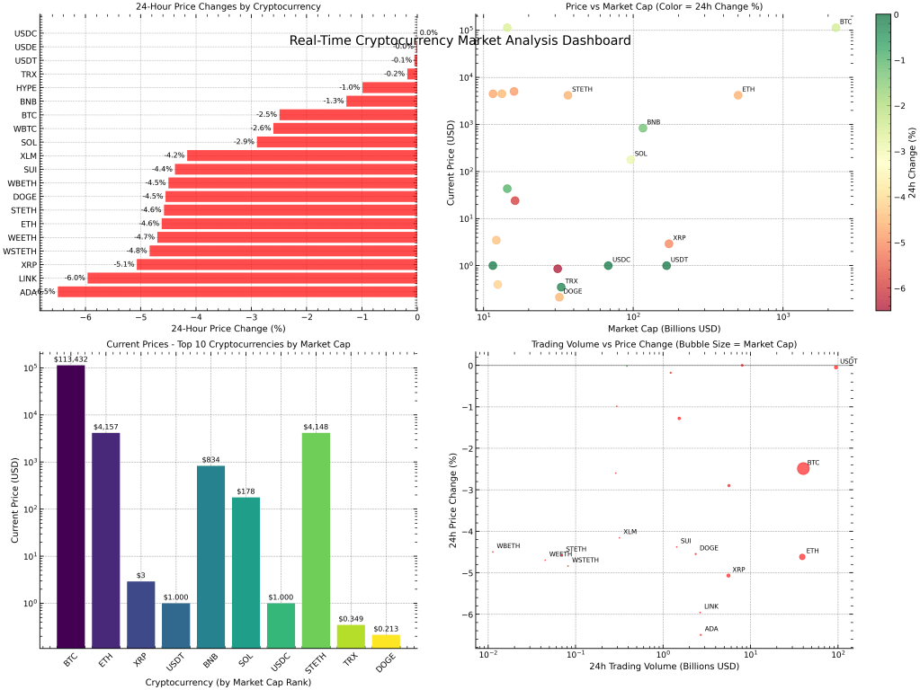 Figura: Panel de mercado cripto en tiempo real – variaciones de precio, capitalización y volumen.