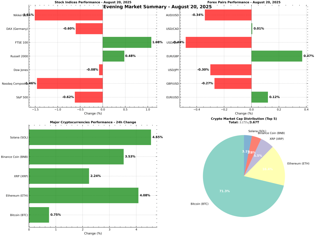 Key Takeaway: Markets remain cautious ahead of the Jackson Hole symposium, with inflation and Fed policy in sharp focus. Defensive assets like gold and oil are holding up, while tech stocks face renewed pressure.
