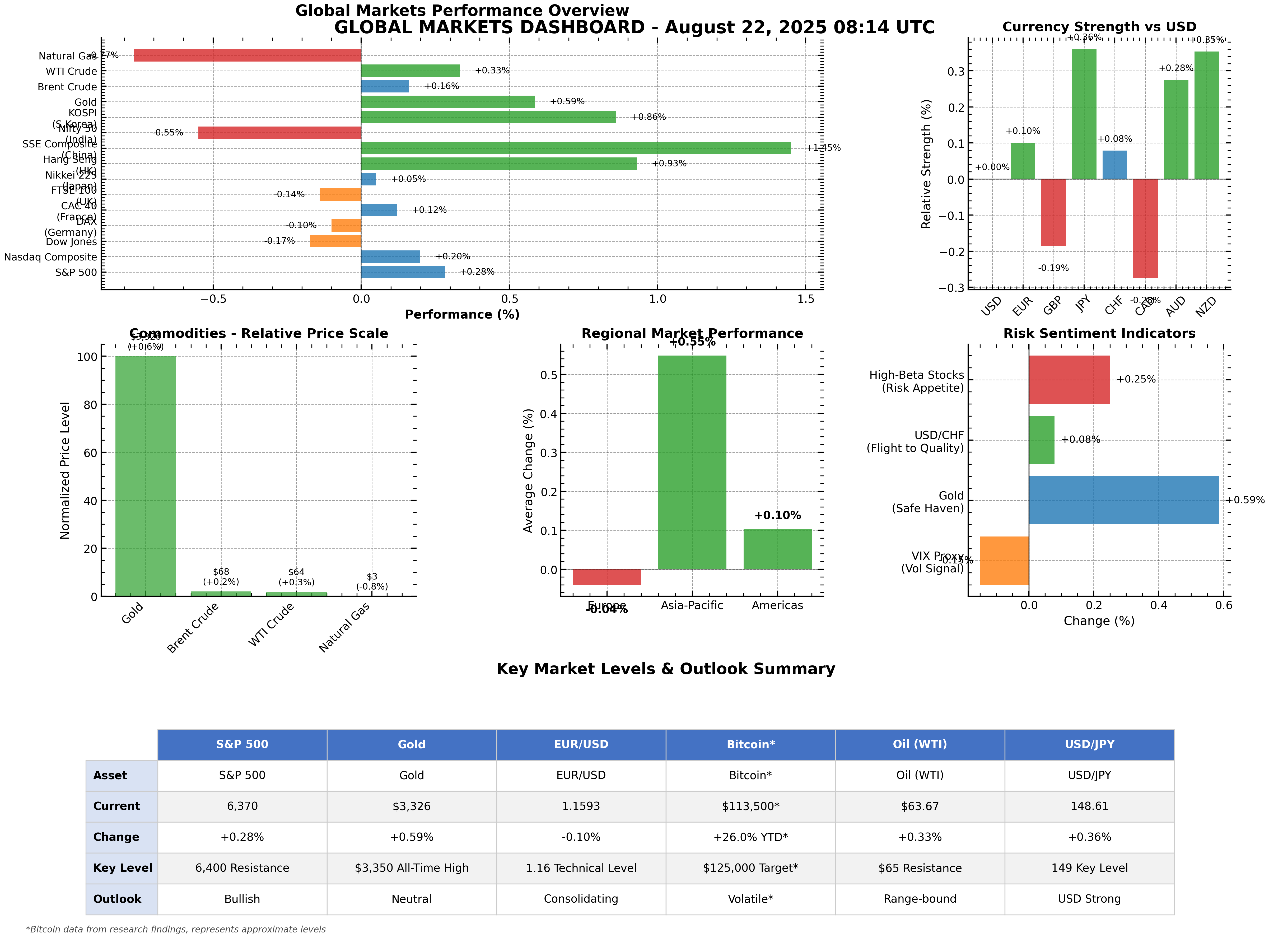 Figure: Global Markets Dashboard – Performance, Currency Strength, Commodities, and Key Levels (Aug 22, 2025)