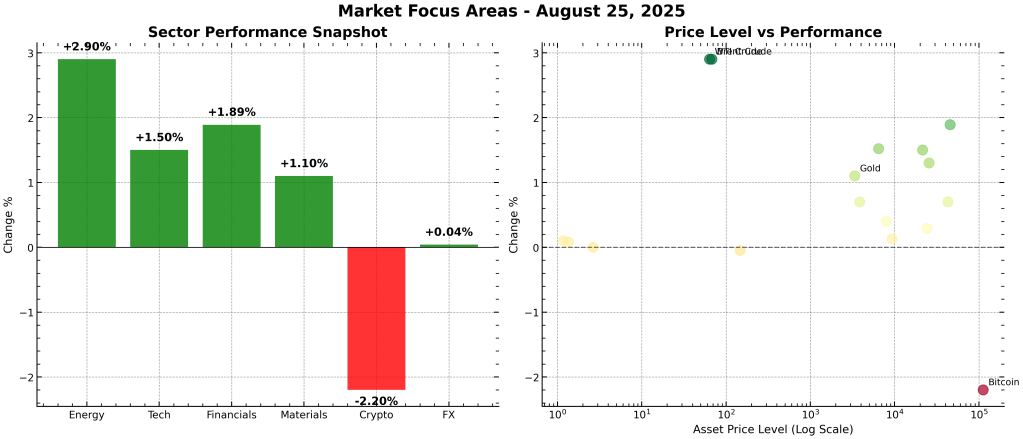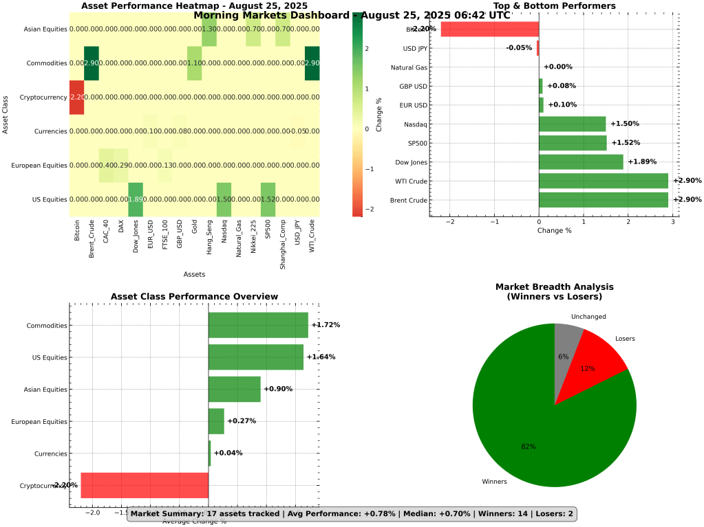 Figure 1: Global Markets Dashboard – Performance Heatmap, Top/Bottom Movers, Asset Class Trends, and Market Breadth (Aug 25, 2025)