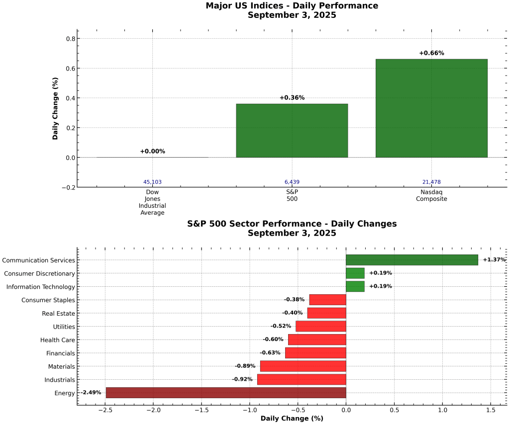 Figura: Rendimiento de índices y sectores de EE. UU. el 3 de septiembre de 2025. El Nasdaq lideró; Energía fue el sector más débil.