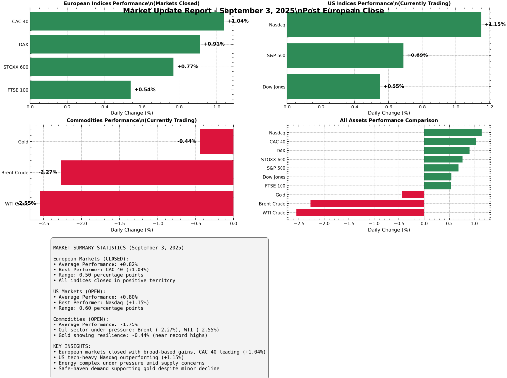 Las bolsas europeas cerraron con sólidas subidas, lideradas por el CAC 40 francés. Mientras continúan abiertas las bolsas estadounidenses, el mercado de divisas, el petróleo y el oro, las tecnológicas en EE. UU. destacan al alza, el petróleo cae con fuerza y el oro se mantiene cerca de máximos históricos.
