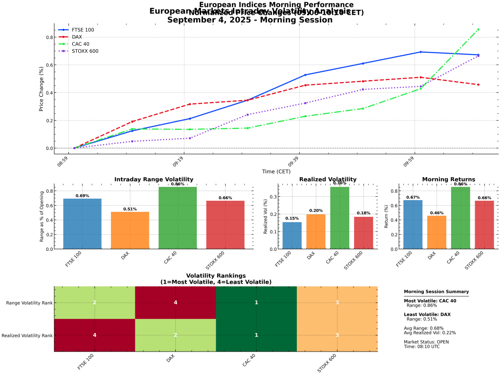 Key Takeaway: European stock markets are trading higher after the first hour, with the CAC 40 leading gains and technology stocks outperforming. Volatility is moderate, and all major indices are above their opening levels. Energy stocks are under pressure, while tech and consumer discretionary sectors shine. Commodities and forex remain stable, and the session’s momentum is positive.