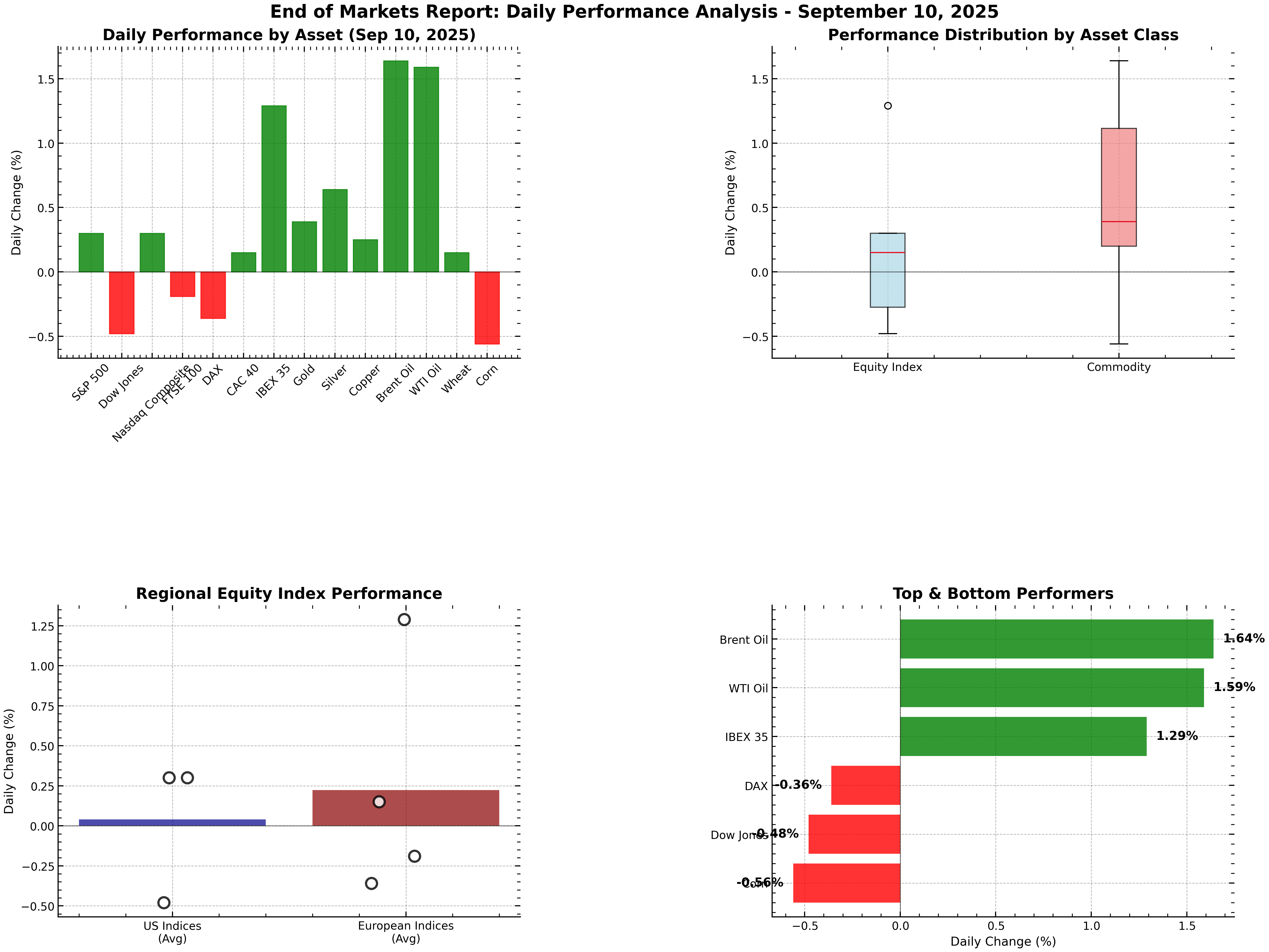 Resumen clave: Los mercados globales cerraron con tono mixto: los índices estadounidenses alcanzaron nuevos máximos históricos impulsados por la fortaleza del sector IA y cloud, las bolsas europeas terminaron mayormente planas o a la baja, y las materias primas—especialmente el petróleo y los metales preciosos—destacaron al alza. El dólar estadounidense se mantuvo estable, mientras el sentimiento de mercado mejoró gracias a los datos de inflación moderados y las crecientes expectativas de un recorte de tipos por parte de la Fed.