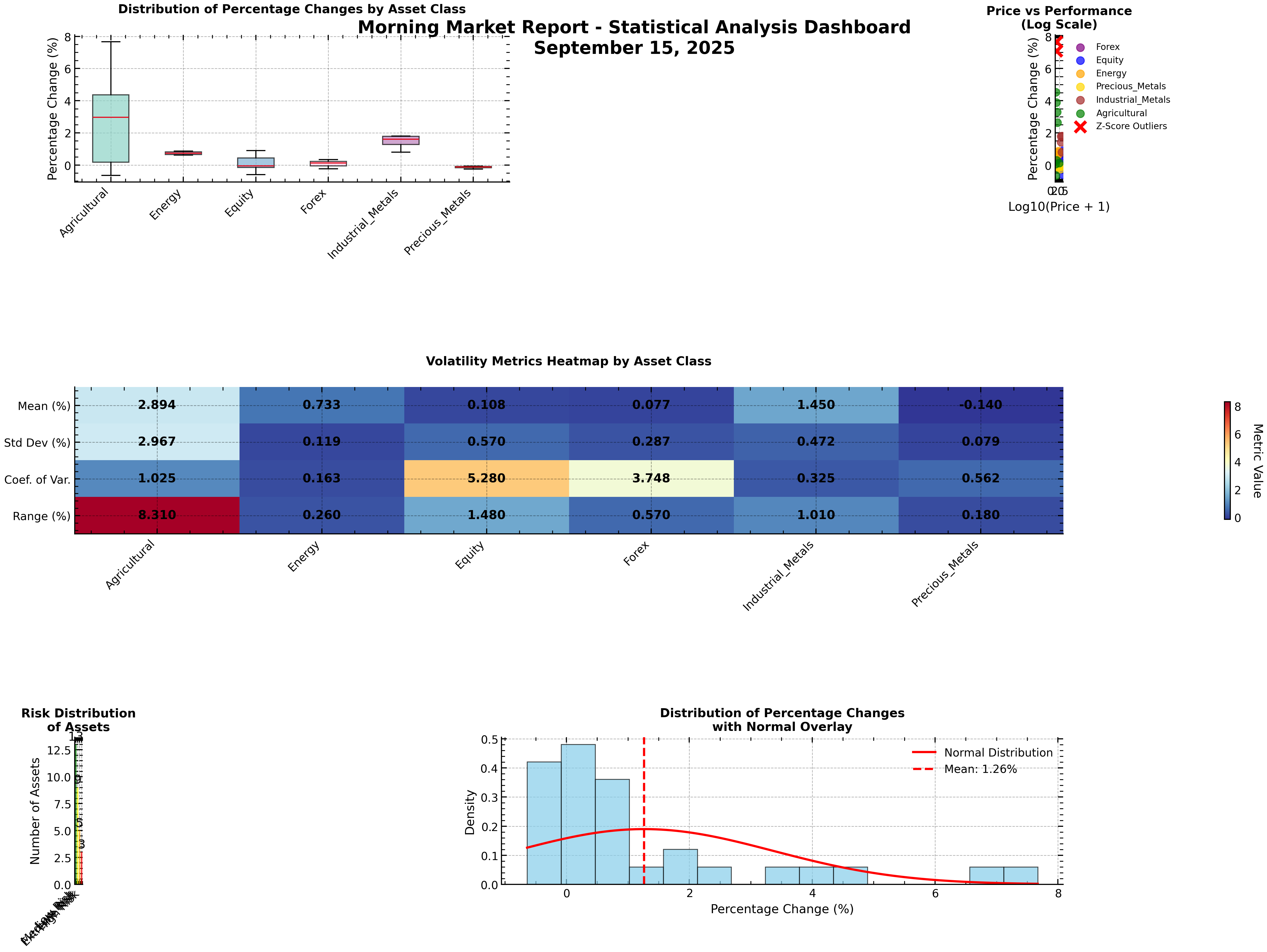 Figura: Distribución de variaciones porcentuales, volatilidad por clase de activo, outliers y riesgo en el mercado global (15/09/2025).