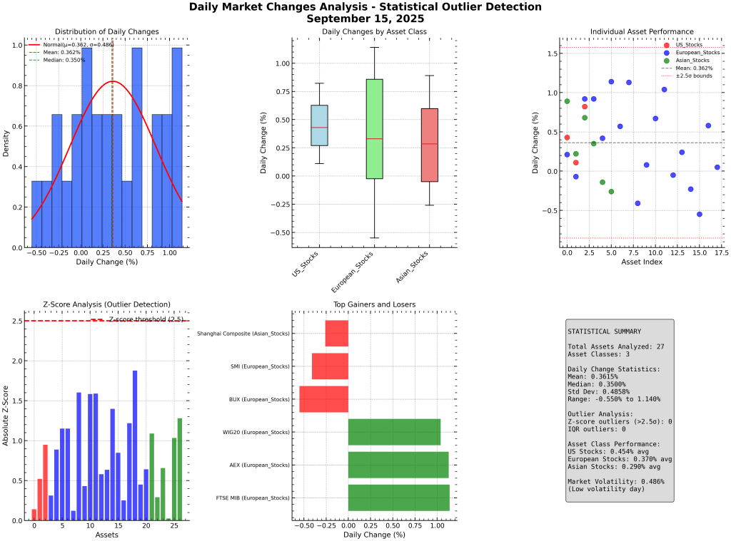 Los mercados globales cerraron la jornada con un tono positivo: los índices estadounidenses marcaron nuevos máximos históricos antes del cierre, las bolsas europeas finalizaron mayoritariamente al alza con el CAC 40 y el Euro Stoxx 50 liderando las subidas, y los mercados asiáticos registraron avances moderados. Las materias primas como el oro y el petróleo continuaron su rally, mientras que en el mercado de divisas el euro y la libra se fortalecieron frente al dólar. No se detectaron outliers ni volatilidad extrema, lo que confirma un entorno estable y de apetito por el riesgo.