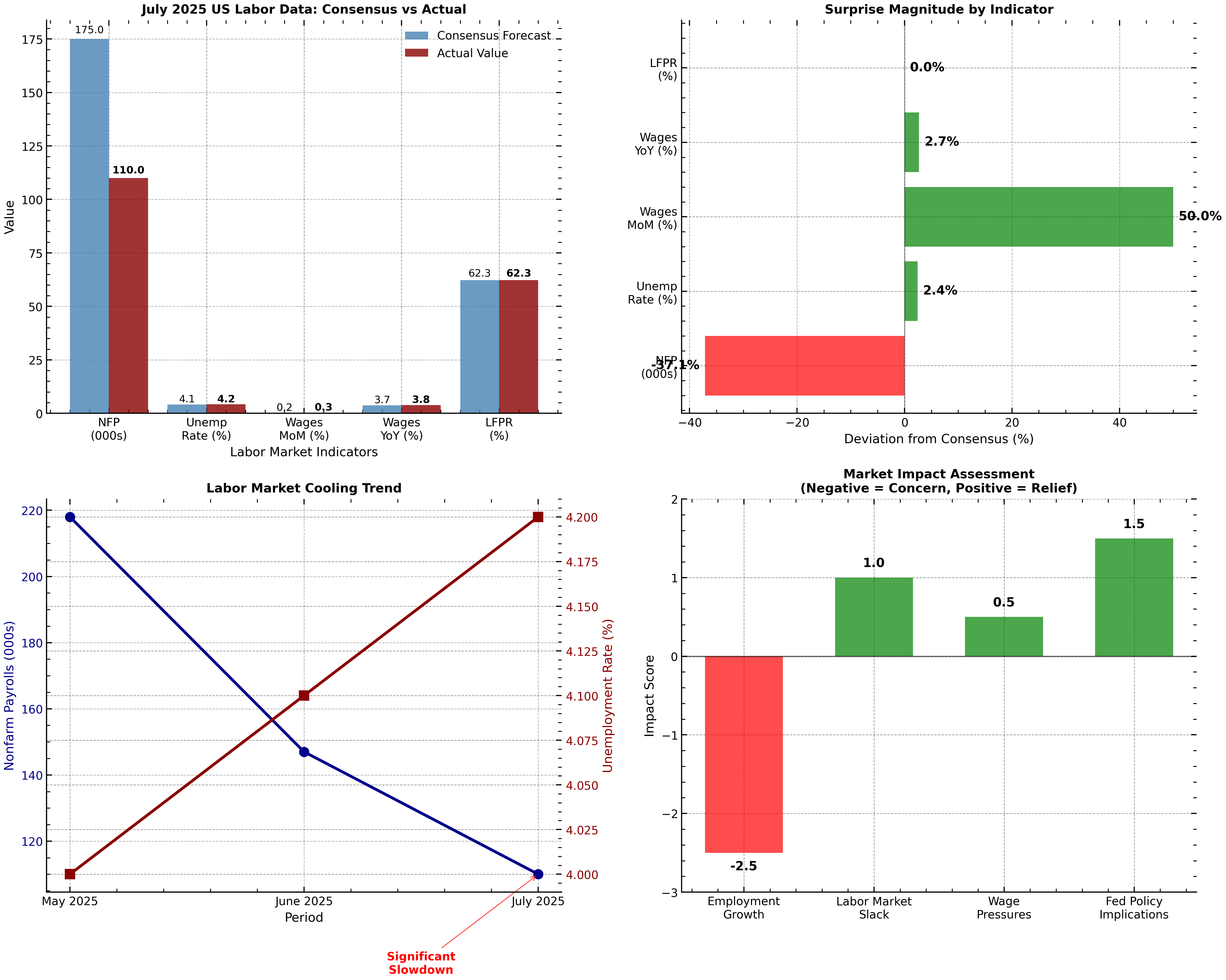 La mayor decepción fue en la creación de empleo, con las nóminas llegando en 65.000 por debajo del consenso—un 37 % menos. El desempleo subió a 4,2 %, el nivel más alto en más de dos años, mientras que el crecimiento salarial sorprendió levemente al alza. La señal general: el mercado laboral de EE.UU. se está enfriando, pero no colapsando.