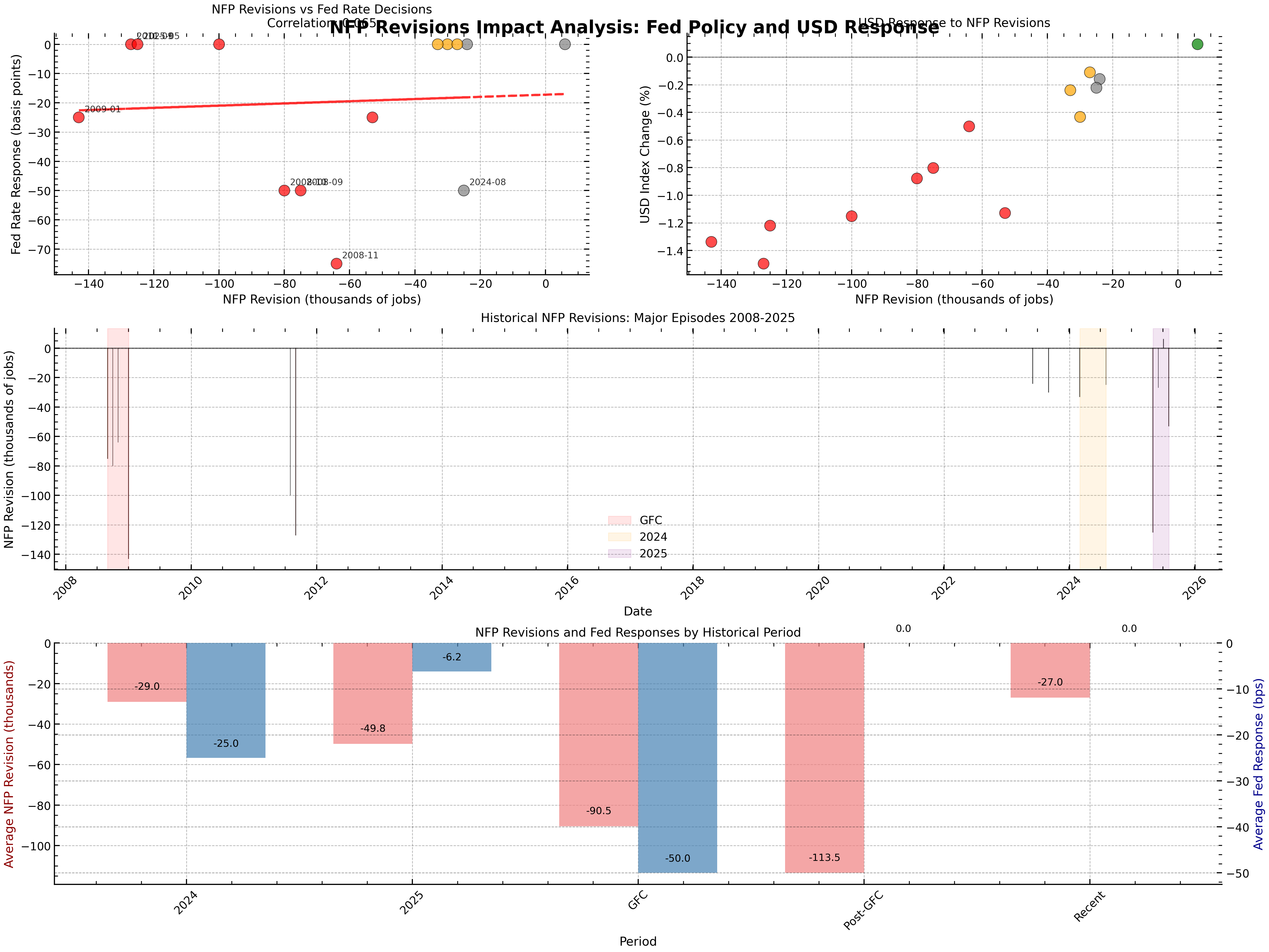 Figure: Major NFP revisions have historically triggered aggressive Fed rate cuts and sharp USD declines. The 2024 benchmark revision led to a 50bps cut; 2025 could repeat the pattern.