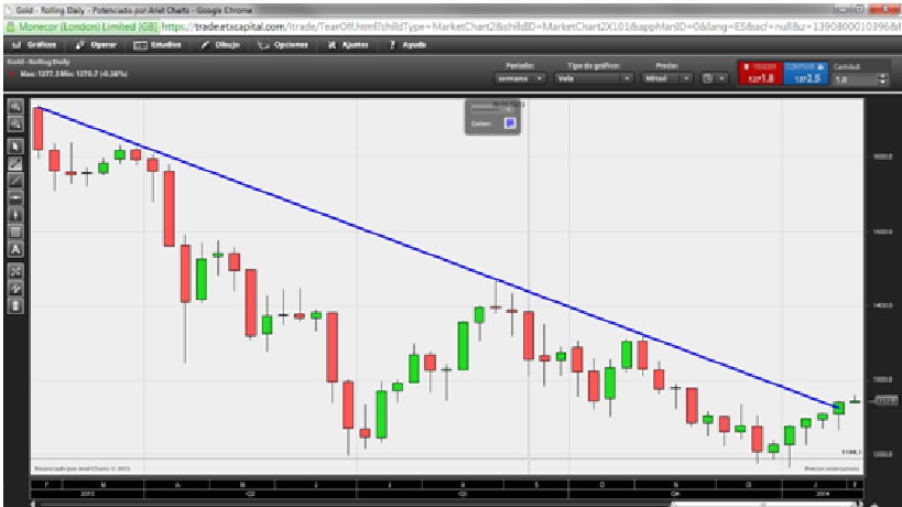 A lo largo de 2013 el oro ha ido siguiendo una tendencia bajista con dos empujes alcistas menores en el tercer y cuarto trimestre del año y un tercer impulso ya en enero de 2014 que por fin ha roto la resistencia al cuarto intento, según puede verse en el gráfico adjunto.